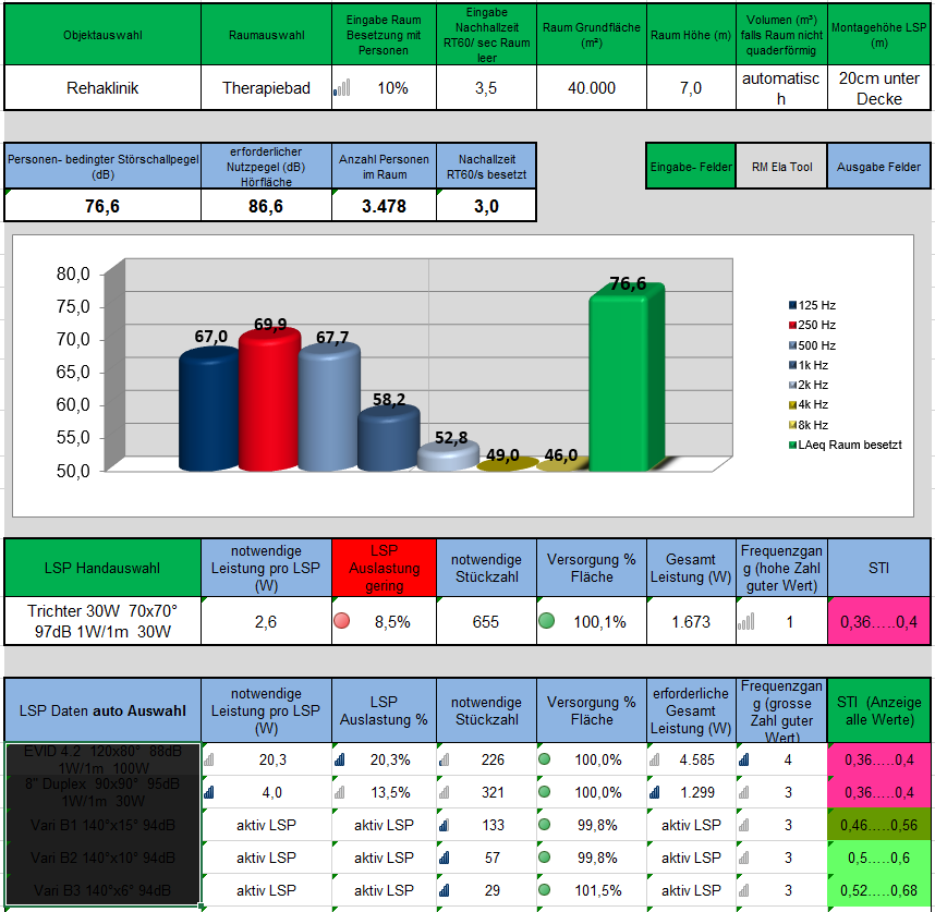 das EXCEL Audio Ela Tool, mit Berechnung des Personen, Raum und Nachhallzeit - abhängigen Störschallpegels, sowie der